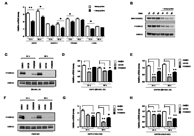 The melanoma cell lines (FM55-M2 and SK-MEL-28) were cultured in RPMI 1640 medium, supplemented with 10% (v/v) fetal bovine serum and 0.1% (v/v) penicillin-streptomycin. The inducible cell line FM55-M2: TREx: V600EBRAFsh was likewise cultured in RPMI 1640 medium, but supplemented with 10% (v/v) tetracycline system approved fetal bovine serum (Clontech). Melanocytes were cultured in Medium 254 for melanocytes with Human Melanocyte Growth Supplement, 0.1% (v/v) penicillin-streptomycin and 0.1% (v/v) gentamicin-amphomycin. All cell cultures were maintained in atmospheric conditions at 37°C of 5% CO2 and 21% O2.