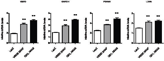 Figure 5: Ectopic expression of V600EBRAF or Q61LNRAS increases the expression of metabolic genes. Expression of G6PD, GAPDH, PGAM1 and LDHA was investigated in melanocytes following transfection with plasmids expressing activated oncogenes (V600EBRAF or Q61LNRAS) or control plasmid (containing Lac-Z). The expression of the genes was normalized to the expression of the housekeeping gene RPLP0, based on average from three experiments. Data are presented as the means ± SD of three experiments and statistical analysis was performed using one-way ANOVA and Tuckey’s multiple comparisons test (** = p < 0.01).