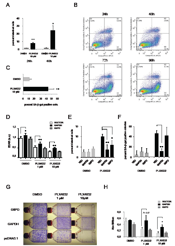 Figure 7: Overexpression of GAPDH abrogates oncogene addiction. Examination of SK-MEL-28 cells treated with PLX4032 (A) percentage of cells detaching following treatment with DMSO or 10µM PLX4032 for 24 or 48 hours. (B) FACS analysis of Annexin V-stained cells revealing the percentage of apoptotic cells at different time-point following treatment with 10µM PLX4032 (C) percentage of cells showing positivity for senescence-associated beta-galactosidase (SA-β-gal) following treatment with 10 µM for one week. (D-H) The effect of stable overexpression of metabolic enzymes in SK-MEL-28 cells prior to treatment with PLX4032. Cells were transfected with plasmids conferring resistance to G418 and having either no insert (vector) or expressing G6PD or GAPDH. Selection with G418 was performed for 14 days before treatment with PLX4032. (D) Extracellular acidification rates in stably transfected cultures treated for 48 hours with DMSO or PLX4032 (1µM or 10µM). (E) Percentage of cells in stably transfected cultures detaching following treatment for 48h with DMSO or 10µM PLX4032. (F) Percentage of G418-resistant colonies showing positivity for SA-β-gal following treatment with 1 µM for one week. (G) Representative pictures from a colony formation assay involving selection with G418 for two weeks followed by treatment with DMSO or PLX4032 (1µM and 10µM). (H) Quantification of adhering cells in (G) by crystal violet staining, extraction of the dye and measurement of A595. Shown are the means ± SD of three independent experiments. Unless stated otherwise, all experiments shown are representative of two independent experiments