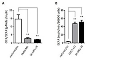 Figure 1: Basic metabolic characteristics of primary melanocytes and malignant melanoma cells. (A) Ratio between oxygen consumption rate (OCR) and the extracellular acidification rate (ECAR) in melanocytes and melanoma cells. (B) Lactate production (ECAR, mpH/min/10000 cells) in melanocytes and melanoma cells (FM55-M2 and SK-MEL-28). Data are presented as the means ± SD (n = 12) from one experiment and are representative of three independent experiments. Statistical analysis were performed with one-way ANOVA using Tuckey’s multiple comparisons test to calculate significance (** = p < 0.01).
