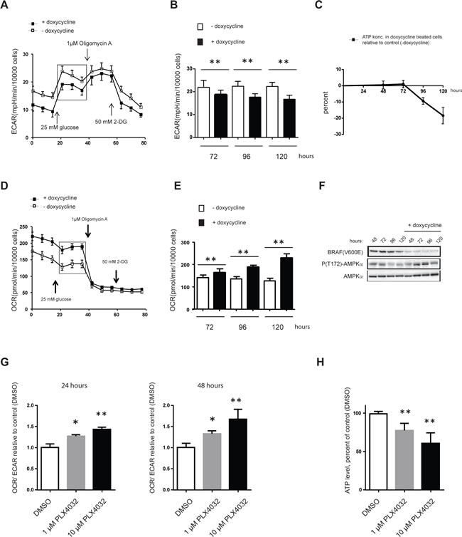 Figure 6: Reversal of the Warburg effect following V600EBRAF knock-down results in ATP depletion. OCR, ECAR and ATP levels in FM55-M2: TREx: V600EBRAFsh cells undergoing doxycycline-induced knock-down of V600EBRAF (A-F) or SK-MEL-28 cells undergoing PLX4032 mediated inhibition of V600EBRAF (G and H). (A) Real-time measurements of ECAR in FM55-M2 following doxycyclin-induced knock-down of V600EBRAF for 96 hours. (B) Basal ECAR following doxycyclin-induced knock-down of V600EBRAF for 72, 96 or 120 hours. (C) Measurement of ATP levels following doxycyclin treatment for 48, 72, 96 and 120 hours. (D) Real-time measurements of OCR in FM55-M2 following doxycyclin-induced knock-down of V600EBRAF for 96 hours. (E) Basal OCR values following doxycyclin-induced knock-down of V600EBRAF for 72, 96 or 120 hours. (F) Immunoblot analysis of FM55-M2: TREx: V600EBRAFsh cells undergoing doxycycline-induced knock-down of V600EBRAF. Shown are the levels of V600EBRAF, phospho-(Thr172)-AMPKα and total AMPKα at different time-points. (G) Real-time measurements of OCR/ECAR ratios in SK-MEL-28 following treatment with DMSO or PLX4032 (1µM or 10µM) for 24 or 48 hours. Data are presented as the means ± SD (n = 6) from one experiment and are representative of two independent experiments. (H) ATP levels in SK-MEL-28 following treatment with 1 or 10 µM of PLX4032 for 48 hours. Data were normalized for protein content and is presented as the means ± SD (n = 8). Statistical analyses were performed with one-way ANOVA and Tuckey’s multiple comparisons test (* = p < 0.05; ** = p < 0.01).