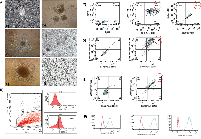 Figure 1: A, B. The establishment of human glioblastoma primary cell culture (A-a). Isolation of tumor neurospheres derived from glioblastoma primary cell culture. (A-b, c) Purification of glioblastoma cells from tumor subspheres using CD133 microbeads. Immunophenotypic characterization by using flow cytometry to evaluate the efficiency of magnetic cell separation for the antigenic marker, CD133 (78.0%). (B) CD133+ glioblastoma cells were able to further generate subspheres. Culture of glioblastoma subspheres (A-d, e) compared with the absence of subspheres obtained from CD133- fractions. (A-f) Representative figure of five glioblastoma samples at 400X magnification. C-F. Immunophenotyping of CD133+ glioblastoma cells by using flow cytometry. (C) First plot shows the isotype control. The second and third plots show the staining for CD44 and SSEA-3 (99.8%) and Nanog and MSh-1 (96.7%), respectively. (D) The first plot is an unstained sample, and the second plot shows the staining for CD44 and CD133 (94.0%). (E) The first plot is an unstained sample, and the second plot shows the staining for CD90 and CD133 (94.4%). (F) Red (isotype control); Blue (stained sample).