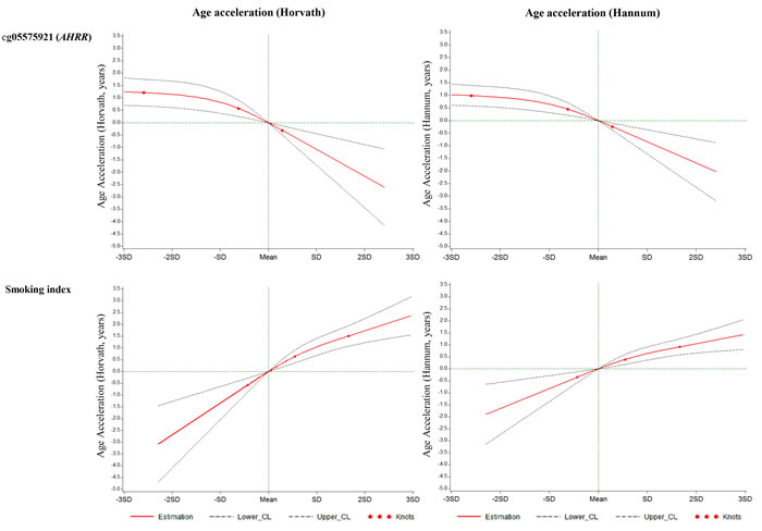 Figure 2: Graphs of the best-fitting models for the associations of cg05575921 and the smoking index with age accelerations in validation panel. Red lines: Estimation; Dashed lines: Confidence limits; Red dots: Knots (25th, 50th and 75th quartiles); Green lines: reference lines.
