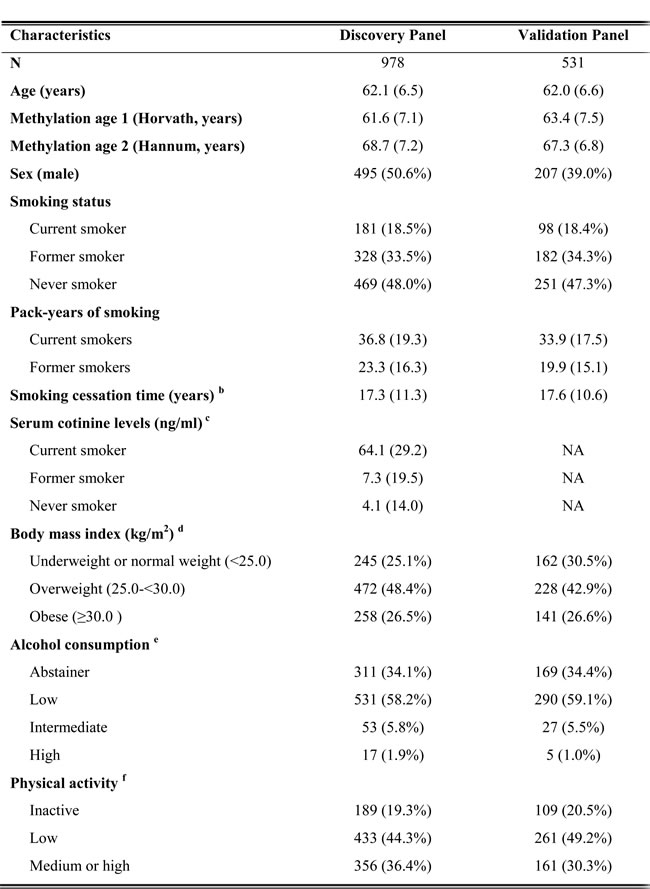 Study subjects were selected from the ESTHER study, an ongoing statewide population-based cohort study conducted in Saarland, a state located in southwest Germany. Details of the study design have been reported previously [48]. Briefly, 9949 older adults (aged 50-75 years) were enrolled by their general practitioners during a routine health check-up between July 2000 and December 2002, and followed up thereafter. Two independent subgroups were selected as discovery panel and validation panel, respectively, for epigenetic analyses. The discovery panel included 1000 participants recruited consecutively at the start of ESTHER study between July and October 2000. The validation panel included 548 participants randomly selected from participants recruited between October 2000 and March 2001. The study was approved by the ethics committees of the University of Heidelberg and the state medical board of Saarland, Germany. Written informed consent was obtained from all participants.