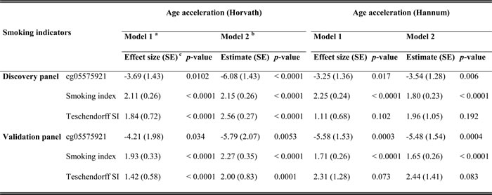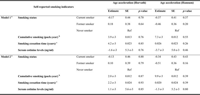 Table 2: Associations of self-reported smoking indicators and cotinine levels with age acceleration in the discovery panel