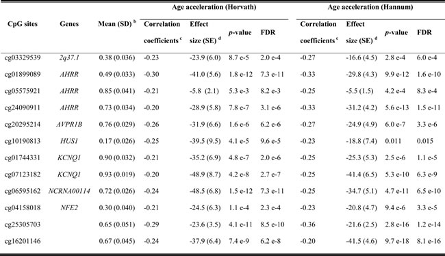 Table 3: Top 12 significantly age acceleration related CpG sites in validation panel a