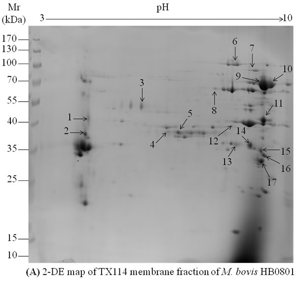 M. bovis MAPs were fractionated using TX-114 as previously described [48] with minor modifications. In brief, M. bovis HB0801 pellet was re-suspended in PBS containing 4% TX-114 (Sigma) and 1 mM PMSF (Sigma) and kept for 3-5h at 4°C after scraping. Un-lysed cells and debris were precipitated and removed by centrifugation for 15 min at 15,400 g. The supernatant was then incubated for 20 min at 37°C and then centrifuged for 5 min at 7500 g to separate the two phases. The upper aqueous phase was discarded and the lower detergent phase was reconstituted to the original volume with 1 mM PMSF in PBS for washing. After washing, the proteins in the detergent phase were re-established in 100% methanol and incubated overnight at -80oC. After centrifugation for 20 min at 15,400 g, the proteins were re-suspended in lysis buffer. Protein concentration was measured with a 2D quant kit (GE Healthcare, Sweden).