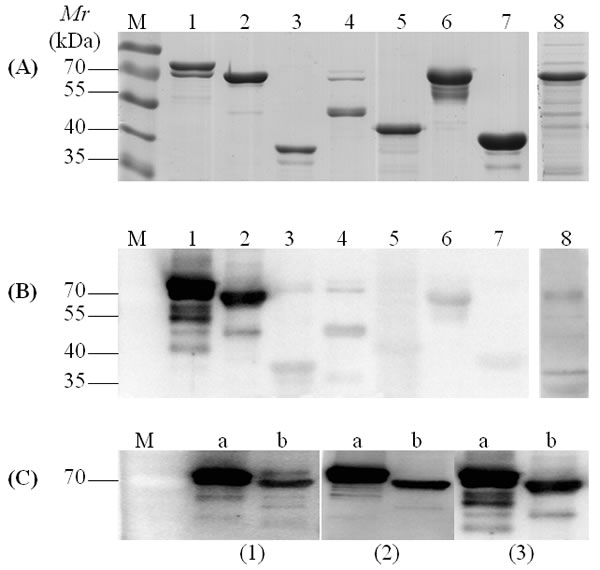 The 8 purified recombinant proteins (2 µg) were separated by 12% SDS-PAGE and blotted onto a PVDF membrane. After blocking, recombinant proteins were probed with serum samples collected from the following groups of animals: (a) M. bovis HB0801-infected calves 35 days after infection; (b) M. bovis-150-immunized calves 35 days post-vaccination; and (c) naturally infected calves.