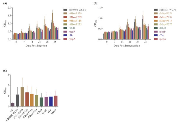 In addition, the eight recombinant antigenic proteins (Table 3) and M. bovis WCPs were characterized with iELISAs. iELISA conditions were optimized for M. bovis WCPs and each recombinant protein as described elsewhere [49]. In brief, 96-well microtitre plates were coated overnight at 4oC with 125 ng of WCPs and 250 ng of each purified recombinant protein diluted in 100 μL sodium carbonate buffer (pH 9.6) and washed with PBS containing 0.05% Tween 20 (PBST). After blocking, the plates were probed for 1 h at 37oC with sera at various dilutions collected from the experimental and naturally infected groups of calves described above. After washing with PBST, plates were incubated for 1 h at 37oC with goat anti-bovine IgG-HRP (1:5000) (Southern Biotech Co. USA) and washed with PBST followed by the addition of tetramethylbenzidine (TMB)/H2O2 (Wuhan Keqian Biological Co., Ltd, China) as a substrate. The reaction was stopped after 10 min and OD values were obtained with a microtiter plate reader (BioTek, USA) at 630 nm (OD630). Cut-off OD630 values were determined for WCP and recombinant protein-based iELISAs using serum samples from the 46 uninfected animals. Mean OD630 values and standard deviations were calculated, and cut-off values were set at mean+2SD.