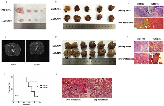 Figure 3: Up-regulation of miR-375 inhibits CRC metastasis in vivo. A. Photographs of xenograft formation in mice implanted withHCT116 cells containing miR-375 or miR-NC vector. Twelve weeks after orthotopic implantation, the mice in both groups were euthanized to remove the xenografts. Xenograft formation was markedly reduced in mice bearing miR-375 HCT116 cells compared with mice bearing miR-NC vector cells. B. Twelve weeks after orthotopic implantation, the mice were euthanized to examine the livers for tumor metastases. Two liver metastases were found in the miR-NC group, but no metastases were found in the in miR-375 group. The arrows indicate surface metastatic nodules. C. The characteristics of tumor cells in the orthotopic xenografts and liver metastases were visualized by H&E staining. D. Representative MRI images of mice that had developed liver metastases after spleen injection. E. Six weeks after spleen injection, the mice in both groups were euthanized to collect their livers. The arrows indicate surface metastatic nodules. F. The characteristics of tumor cells in the spleen and liver metastases were visualized by H&E staining. G. Six-week-old male NOD/SCID mice were subcutaneously injected with HCT116 cells stably expressing the miR-375 or miR-NC vector, and the survival rates of the two groups of mice were calculated. Survival tended to be longer in the miR-375 group than in the control group. H. Liver metastases and lung metastases in the NOD/SCID mice, which were implanted with the indicated cells, were confirmed by H&E staining.