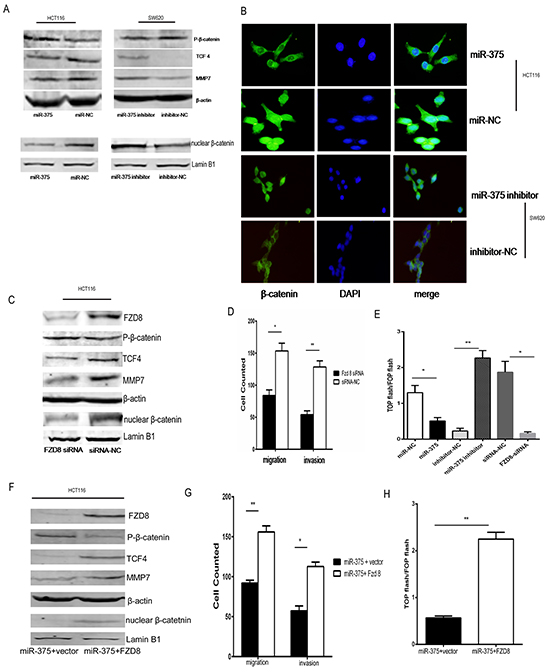 Figure 5: miR-375 modulates the Wnt/β-catenin pathway by targeting FZD8. A. Western blot analysis of phosphorylated β-catenin, TCF4, MMP7 and nuclear β-catenin protein expression response to deregulated miR-375 expression in the indicated cells. Nuclear fractions of the indicated cells were analyzed by western blotting. Lamin B1 was used as a loading control. B. Subcellular β-catenin localization in indicated cells was assessed by immunofluorescence staining. C. The knockdown of FZD8 in HCT116 cells with specific siRNA was confirmed by western blotting. The expression levels of phosphorylated β-catenin, TCF4, MMP7 and nuclear β-catenin in response to downregulated FZD8 were analyzed by western blotting. D. The migration and invasiveness of HCT116 cells were analyzed after transfection with FZD8 siRNA. E. Indicated cells transfected with TOP flash or FOP flash and Renilla pRL-TK plasmids were subjected to dual-luciferase assays 48 hours after transfection. Reporter activity detected was normalized by Renilla luciferase activity. F. Altered FZD8 expression in HCT116 cell bearing up-regulated miR-375 in response to FZD8 transfection and the expression of phosphorylated β-catenin, TCF4, MMP7 and nuclear β-catenin protein were analyzed by western blotting. All experiments were repeated at least three times. G. The migration and invasiveness of HCT116 cell bearing up-regulated miR-375 were analyzed after FZD8 transfection. The indicated migrating or invading cells were quantified in 5 random fields after culture in matrigel-coated or non-coated transwell assays, respectively. H. Luciferase-reported TCF/LEF transcriptional activity in indicated cells. The experiment was repeated at least three times, and error bars represent the mean±SD. * p<0.05,**p<0.01.