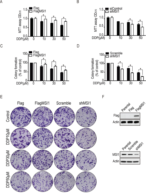Figure 1: Musashi-1 enhanced cell viability and colony formation under DDP treatment in GBM cells. A. The Flag-tagged Musashi-1 (FlagMSI1) and empty vector (Flag) transfected stable cells were established in 05MG GBM cell line and subjected to a dose-course DDP treatment. The cell viability was determined by MTT assay. B. Control (siControl) and siMusashi-1 (siMSI1) siRNA transfected 05MG cells were subjected to MTT viability assay under dose-course DDP treatment. C. 05MG-FlagMSI1 and 05MG-Flag cells were treated with different concentration (from 0 to 50 μM) of DDP for 24 hours, followed by a colony formation assay incubated for 10 days allowing the survived cells forming colonies. Data represent the mean ± S.D. of three independent experiments performed in triplicate. * P<0.05 vs control cells. D. Musashi-1 knockdown (shMSI1) cells and scrambled shRNA (scramble) transfected control cells were established in 05MG GBM cell line and subjected to a colony formation assay as described in C. E. The formation of colonies in C and D was photographed. F. Protein expression level for MSI1 in MSI1-overexpressed cells and knockdown cell lines by Western blotting.
