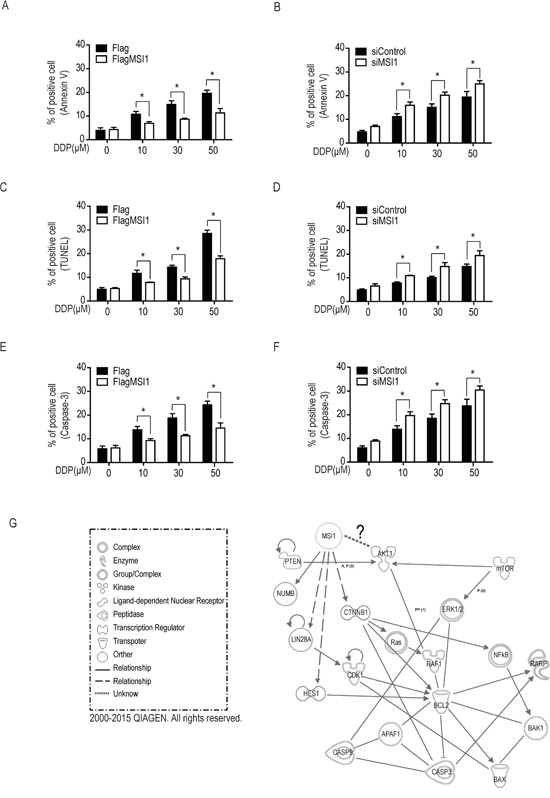 Figure 2: Musashi-1 mitigated DDP-induced apoptosis in GBM cells. A-F. MSI-overexpressed (A, C, E) and knockdown (B, D, F) cells were treated by a dose-course of DDP for 24hrs. The apoptotic cells were identified by the staining of AnnxinV (A-B), terminal deoxynucleotidyl transferase dUTP nick end labeling (TUNEL; C-D, and activated caspase-3 (E-F) and quantified by flow cytometer. Data represent the mean ± S.D. of three independent experiments performed in triplicate. * P<0.05 vs control cells. G. The identified significant cell survival pathway from the mRNA array analysis are organized in a connectivity network constructed by Ingenuity IPA software. Both MSI1 and AKT were the core factors in this network.