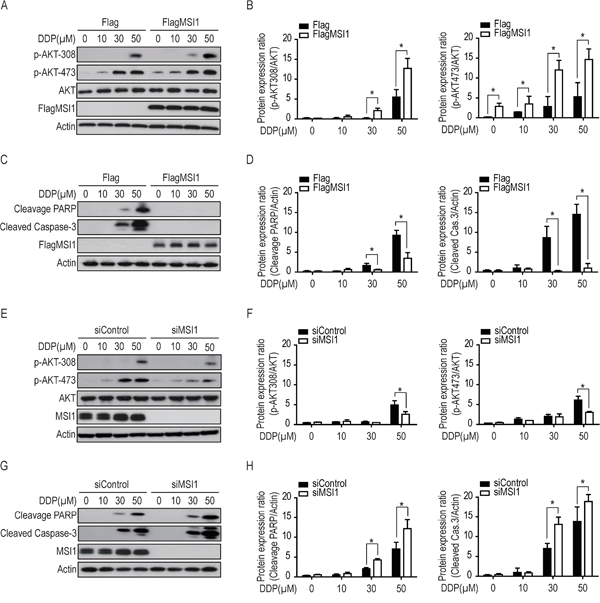 Figure 3: Musashi-1 enhanced AKT phosphorylation and reduced the levels of cleaved-caspase-3 and cleavage-PARP under DDP treatment. A-D. 05MG-FlagMSI1 and 05MG-Flag cells were treated with different concentration (from 0 to 50 μM) of DDP for 24 hours. Total lysates were analyzed by Western blot to assess the level of phosphorylated AKT (A-B), and cleaved PARP / Caspase-3 (C-D). The levels of phosphorylated AKT (B) and cleaved PARP / Caspase-3 (D) were quantified and standardized with the levels of total AKT and actin, respectively. E-H. 05MG-siMSI1 and 05MG-siControl cells were treated with different concentration of DDP for 24 hours, followed by Western blot analysis and quantification as described in A-D. Data represent the mean ± S.D. of three independent experiments performed in triplicate. * P<0.05 vs AKT or Actin.