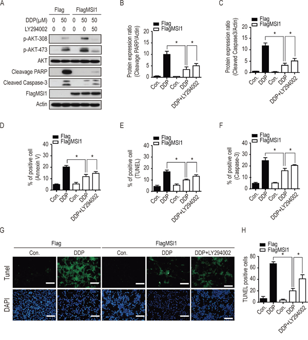 Figure 4: Inhibition of AKT activity blocked the suppressive effect of Musashi-1 on DDP-induced apoptosis. A-F. 05MG-FlagMSI1 and 05MG-Flag cells were pretreated with 50 μM of LY294002 or vehicle for 3 hours, followed by 50 μ0e addtreatment for additional 24 hours. A. Total cellular extracts were analyzed by Western blot analysis. B. Quantified cleaved PARP protein levels in A were standardized with actin level. C. Quantified cleaved Caspase-3 protein levels in A were standardized with actin level. Data represent the mean ± S.D. of three independent experiments performed in triplicate. * P<0.05 vs actin. D-F. Percentage of apoptotic cells were quantified by Flow cytometry in Annexin V (D), TUNEL (E), and Caspase-3 (F) assay. Data represent the mean ± S.D. of three independent experiments performed in triplicate. G. Green fluorescence indicates TUNEL positive cells. Top panel: apoptotic cells stain with FITC; bottom panel: nuclei stained with DAPI. H. Quantitative evaluation of TUNEL positive cells. Eight images were analyzed in five 05MG sections from each group. Data represent the mean ± S.D. of two independent experiments performed in duplicate. * P<0.05 vs Flag control or FlagMSI1 add DPP. Scale Bar =100 μm.