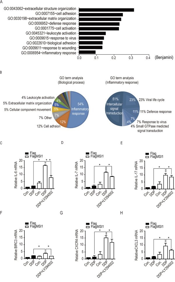 Figure 5: Identification of mRNA expression profiles in Musashi-1 overexpressed cells under DDP treatment. A. Gene ontology (GO) enrichment analysis was conducted by DAVID software according to the category of biological processes. Benjamini ≤ 0.05 is selected as interesting GO. The GO accession, name, and the corresponding p-value were shown in the graph. B. Top 50 GO classes were analyzed by the visualization software REVIGO (REduce and VIsualize GO; (Supek et al., 2011); http://revigo.irb.hr/). The number on each pie shows the corresponding GO term and its percentage. GO ID number and log (p-value) of each GO term is indicated. C-H. Cells were pretreated with 50 μM of LY294002 or vehicle for 3 hours, followed by 50μM DDP treatment for 24 another hours. Total cellular extracts were analyzed by real-time PCR to validate the mRNA levels of IL-6, IL-7, IL-17, BICR3, CXCR4 and CXCL3. The relative expression levels of each mRNA was standardized with actin mRNA level.