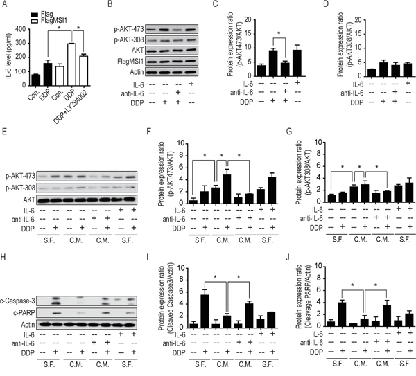 Figure 6: Musashi-1 mitigated DDP-induced apoptosis via the IL-6/AKT regulatory loop. A. Cells were pretreated with 50 μM of LY294002 or vehicle for 3 hours, followed by 50 μM DDP treatment for 24 hours. The culture media were collected and the concentrations of IL-6 was determined by ELISA. B. 05MG-FlagMSI1 cells were treated with/without 50 μM DDP for 24 hours in the absence or presence of recombinant IL-6 (10 ng/ml) or anti-IL-6 neutralizing antibody (0.1 μg/ml). The cell lysates were analyzed by Western blot. C-D. The bar diagrams represent the quantified ratio of p-AKT-308/AKT and p-AKT-473/AKT obtained by the Western blot in B. E. 05MG cells were treated with control (serum free medium, S.F.) or condition media from 05MG-FlagMSI1 cells (C.M.) in the presence or absence of 50 μM DDP, IL-6 (10 ng/ml), and anti-IL-6 antibody (0.1 μg/ml) for 24 hours. The cell lysates were analyzed by Western blot to assess the levels of p-AKT-308, p-AKT-473, and total AKT. F-G. The bar diagrams represent the quantified ratio of p-AKT-308/AKT and p-AKT-473/AKT obtained in E. H. 05MG cells were treated as described in E and analyzed by Western blot. I-J. The bar diagrams represent the quantified ratio of cleavage-caspase-3/actin and cleaved-PARP/actin obtained in H. Data represent the mean ± S.D. of two independent experiments performed in triplicate. * P<0.05 vs AKT or Actin.