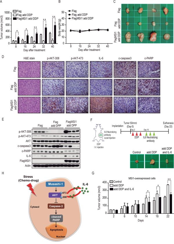 Figure 7: Musashi-1 promoted tumor growth and mitigates stress-induce apoptosis in xenograft animal model. A. Nude mice were subcutaneously transplanted with 05MG-Flag or 05MG-FlagMSI1 cells and were administrated with DDP (20 mg/kg) or PBS through tail vein injection 3 weeks after transplantation, 3 times with 2-day intervals. The tumor size was measure with a caliper. Data were presented as mean±S.D. (n=12). Tumor size of mice with MSI1 overexpressed cells were significantly higher than those of Flag-control mice under DDP treatment (*P<0.05 or **P<0.01). B. Change of mice body weight during the 40 days of observation after DDP administration. C. Xenograft tumors were excised 40 days after DDP treatment. D. Tumor tissue were sectioned and subjected to H.E. staining and immunohistochemistry analysis to evaluate p-AKT-308, p-AKT-473, IL-6, cleaved-caspase-3 and cleaved-PARP expression levels. E. Tumors tissue (four of each group) were harvested and homogenized. Whole-tumor lysates were analyzed by Western blot analysis. F. Schematic illustration depicts the experimental design. Nude mice were subcutaneously transplanted with MSI1-overexpressed cells and were administered with DDP (20 mg/kg) or PBS intravenously 3 weeks after transplantation, 3 times with 2-day intervals. After DDP injection, tumors were administered with IL-6 neutralizing antibody (0.15μg/ml) with intratumoral injection, 3 times with 2-day intervals; G. The tumor sizes were measured with a caliper. Data were mean S.D. (n=3). Statistical analysis was carried out by Student’s t-test (*P<0.05 or **P<0.01). H. A schematic diagram of the MSI1-dependent regulation of cell survival in GBM. In this model, MSI1 enhance AKT phosphorylation, leading to increased IL-6 secretion and decreased caspase3 and PARP activity, protecting GBM cell from chemodrug-induced apoptosis. The feedback regulation between AKT and IL6 augments the anti-apoptotic effect of MSI and maintains cells in a state of less sensitive to chemodrugs.