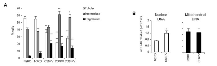 Figure 1: CS-A primary fibroblasts are characterized by altered mitochondrial morphology and present increased levels of oxidative damage in nuclear but not in mitochondrial DNA. A. Distribution of cells according to mitochondrial morphology in primary fibroblasts strains from two normal (N2RO and N3RO) and three CS-A (CS6PV, CS7PV and CS24PV) donors. The reported values represent the mean ±SEM of four independent experiments; *p < 0.01, **p < 0.001 calculated within each morphological category (tubular, intermediate, fragmented) for normal versus CS-A cells. B. Basal levels of 8-OH-Gua measured as its nucleoside 8-hydroxy-2’-deoxyguanosine (8-OH-dG) by using HPLC-ED in nuclear and mitochondrial DNA of normal (N2RO) and CS-A (CS6PV) primary fibroblasts. Bars represent SD; *p < 0.05 normal versus CS-A cells.