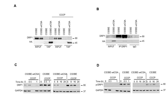 Figure 3: DRP1 interacts with CSA and is hyperactivated in CS-A cells. A. Analysis of the interaction between CSA and DRP1 by TAP in the isogenic cell lines CS3BE and CS3BE-wtCSA after 20 µM CCCP treatment. B. Co-IP of DRP1 in the isogenic cell lines CS3BE and CS3BE-wtCSA. C. Analysis by western blotting of DRP1 and D. of its phosphorylated form at ser616 (p-DRP1) in the isogenic cell lines CS3BE and CS3BE-wtCSA after 20 µM CCCP treatment for different periods of time. Two independent experiments were performed with similar results. DRP1: 80kDa; HA-CSA: 45kDa; GAPDH: 37kDa.