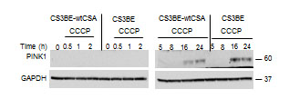 Figure 4: PINK is stabilized in CS-A cells under CCCP exposure. Analysis of PINK1 stabilization by western blotting after 20 µM CCCP treatment for different periods of time in the isogenic cell lines CS3BE and CS3BE-wtCSA. Two independent experiments were performed with similar results. PINK1: 60kDa; GAPDH: 37kDa.