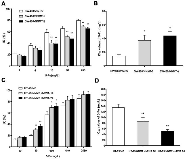 Figure 1: NNMT reduces sensitivity to 5-FU in CRC cells. A, C. The cells were exposed to various concentrations of 5-FU for 48 h, and the IRs were assessed by MTT assay. Data are presented as mean ± SD (n = 5). B, D. 5-FU resistance was evaluated by IC50. Data are presented as mean ± SD (n = 5) (* p < 0.05, ** p < 0.01).