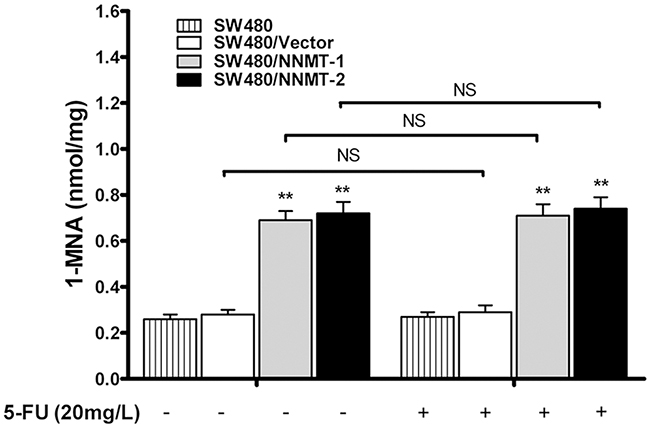 Figure 6: NNMT increases intracellular level of 1-MNA in CRC cells independently of 5-FU. The intracellular 1-MNA was detected after 48 h by HPLC-UV. Values are expressed as means ± SD of three independent experiments (** p < 0.01 vs. control group).