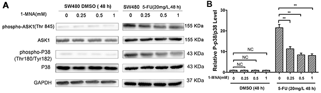 Figure 8: 1-MNA attenuates activation of p38 MAPK pathway in SW480 cells after treatment with 5-FU. A. SW480 cells were incubated with increasing concentration of 1-MNA (0, 0.25, 0.5, 1 mM) and 5-FU (20 mg/L) or vehicle (DMSO) for 48 h, after which the levels of ASK1, p-ASK1, p38 and p-p38 were analyzed by Western blot. GAPDH was used as internal control. The data are representative of three experiments. B. The ratio of p-p38/p38 after protein quantification of the western blot results was shown in (A) compared to the group treated with only DMSO, which was normalized as 1.