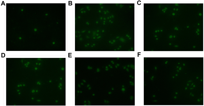 Figure 10: NNMT attenuates the 5-FU-induced apoptosis via 1-MNA in vivo. Apoptosis of tumor cells treated with 5-FU (30 mg/kg) and 1-MNA was detected by TUNEL analysis. A. SW480/Vector cells, B. SW480/Vector cells treated with 5-FU, C. SW480/NNMT-1 cells treated with 5-FU, D. SW480/NNMT-2 cells treated with 5-FU, E. SW480/Vector cells treated with 5-FU and 1-MNA (10 mg/mL), F. SW480/Vector cells treated with 5-FU and 1-MNA (20 mg/mL). The cells overexpressing NNMT or treated with 1-MNA showed less cell death than SW480/Vector cells (p < 0.05). Original magnification: ×400.