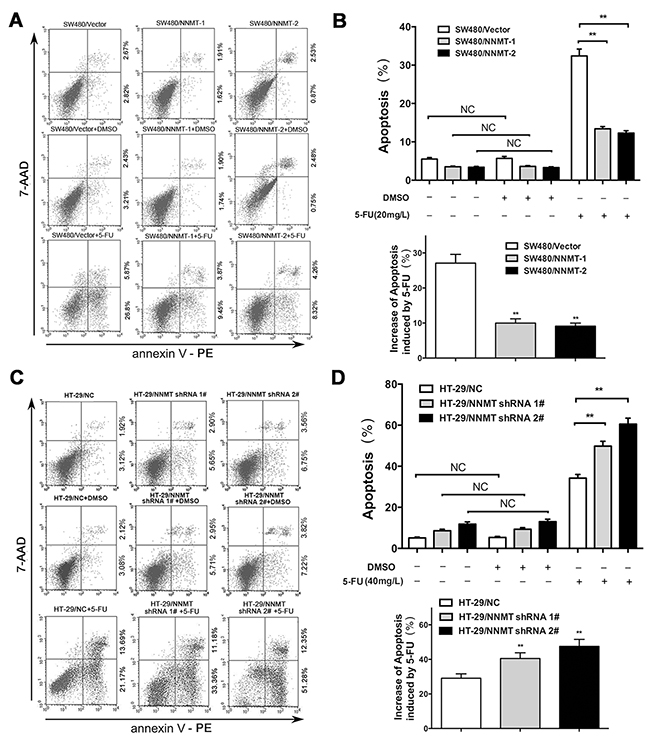 Figure 2: NNMT reduces apoptosis in 5-FU induced CRC cells. A, C. The cells were treated for 48 h with the indicated dose of 5-FU or vehicle (DMSO). Apoptosis was evaluated by Annexin V-PE and 7-AAD after 5-FU treatment. B, D. Histogram shows the combination of the results of three independent experiments performed as in (A) and (C). Data are presented as mean ± SD (** p < 0.01) (n = 3).