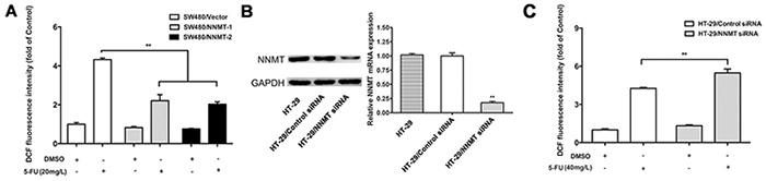 Figure 5: NNMT reduces the ROS production in CRC cells after treatment with 5-FU. The intracellular ROS was detected after 48 h by flow cytometry using the fluorescent probe 2’,7’-dichlorodihydrofluorescein diacetate. Results are represented as fold of DCF fluorescence compared to control. ROS decreased in SW480 cells treated with pcDNA3.1/NNMT A. and increased in HT-29 cells treated with NNMT siRNA C, B. Expression of NNMT in HT-29 cells transfected by siRNAs at a final concentration of 80 nM was analyzed by real-time RT-PCR and western blot. GAPDH was used as an internal control. The western blot is representative of at least three independent experiments. The mRNA levels were normalized to GAPDH levels and all values are shown compared to the control values, which were assumed to be 1. There was a statistical significance between cells transfected with NNMT siRNA and control siRNA (**p < 0.01). Values are expressed as means ± SD of three independent experiments. (** p < 0.01 vs. control group).
