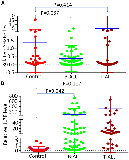 IL7R and SH2B3 expression in patient samples was quantitated as previously described [29, 40]. The expression level of IL7R or SH2B3 was normalized to 18s RNA and expressed as gene expression value of IL7R or SH2B3/18s RNA.