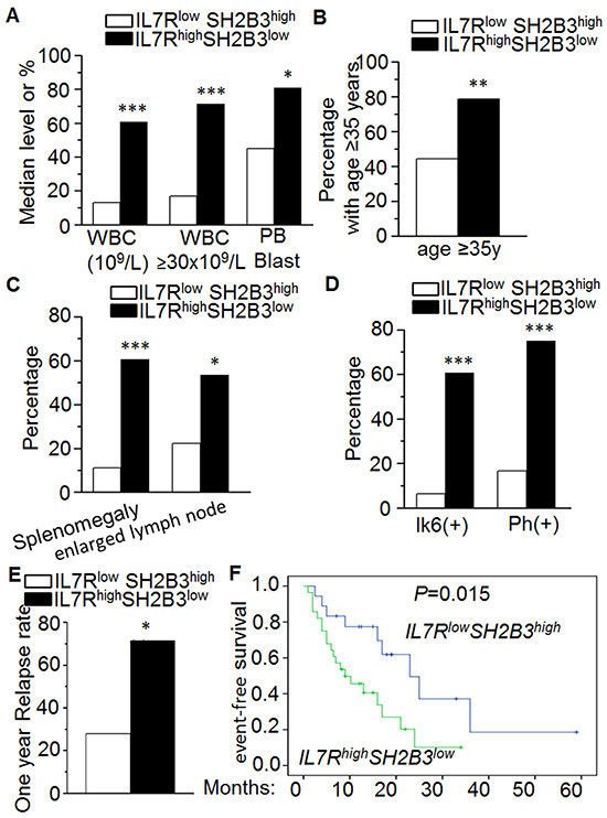 Figure 2: Correlation of IL7RhighSH2B3low expression with clinical features in ALL. A-B. Comparison of high risk factors [high median WBC (109/L), WBC≥30x109/L, PB blasts] (A) and patient age ≥35 years old (B) in patients with IL7RhighSH2B3lowexpression to those in patients with IL7RlowSH2B3highexpression; C-D. Comparison of percentage of splenomegaly or enlarged lymph node (C) and co-existence of Ik6 (+) or Ph (+) chromosome (D) in these two patients’ groups. E-F. Comparison of one-year relapse rate (E) and event-free survival (F) in patients with IL7RhighSH2B3lowexpression to those in patients with IL7RlowSH2B3high expression.