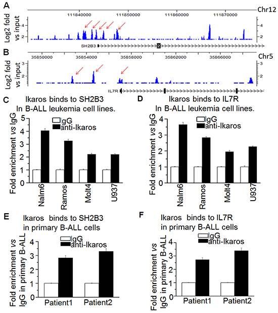Figure 3: Ikaros binds the promoters of SH2B3 and IL7R. A-B. Ikaros binding peaks at the promoter of SH2B3 (A) and IL7R (B). C-D. qChIP assay to assess Ikaros binding at the promoter of SH2B3 (C) and IL7R (D) in leukemic cell lines. E-F. qChIP assay to assess Ikaros binding at the promoter of SH2B3 (E) and IL7R (F) in primary B-ALL patients’ samples.