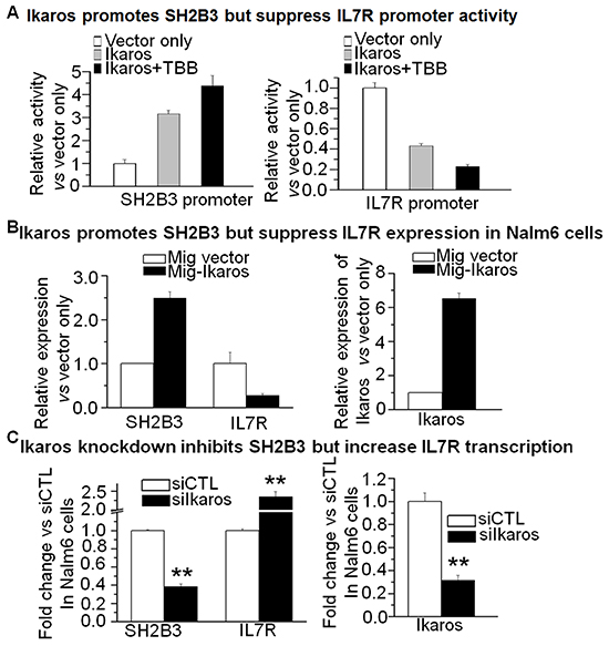 Figure 4: Ikaros promotes SH2B3 but suppresses IL7R transcription. A. The promoter activity of SH2B3 and IL7R promoters by luciferase reporter assay following transfection with Ikaros or control vector in HEK293 cells. B. Expression of SH2B3 and IL7R in Nalm6 cells transduced with vector containing Ikaros as compared to control vector. C. Comparison of SH2B3 and IL7R expression in Nalm6 cells treated with Ikaros shRNA (siIkaros) or scramble shRNA (siCTL). Gene expression is determined by RT-qPCR using total RNA isolated from the cells transfected with scramble shRNA (siCTL) or Ikaros shRNA (siIkaros) for 2 days. compared with siCTL in C: *p <0.05, **p<0.01 compared to siCTL group.
