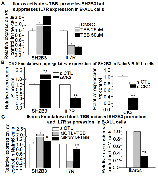 Figure 5: Effect of CK2 inhibitor on expression of SH2B3 and IL7R. A. The CK2 inhibitor, TBB, promotes SH2B3 but suppresses IL7R expression in B-ALL cells as assessed by q-PCR. B. CK2 knockdown promotes SH2B3 but suppresses IL7R expression in B-ALL cells by q-PCR. C. Ikaros knockdown rescues the TBB-induced change in SH2B3 and IL7R in B-ALL cells. Compared with siCTL+TBB in C, D and E: * P<0.05; ** P<0.01.