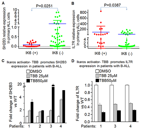 Figure 6: Ikaros deletion results in changes of SH2B3 and IL7R expression in primary B-ALL cells. A-B. comparison of SH2B3 (A) and IL7R (B) in patients with or without Ikaros deletion; C-D. Effect of CK2 inhibitor (TBB) on expression of SH2B3 and IL7R in primary B-ALL cells with TBB treatment for 2 days.