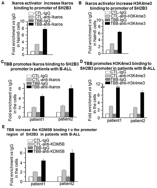 CK2 inhibitor functions to increase Ikaros activity. Ikaros regulates transcription of its target genes via chromatin remodeling by inducing epigenetic changes around the transcriptional start site (TSS) [28]. To understand the mechanisms by which CK2 inhibitor affects Ikaros function to promote SH2B3 expression, we tested whether the activation of SH2B3 is achieved through an epigenetic mechanism. Changes in the epigenetic markings around the TSS of SH2B3 were measured by qChIP following TBB treatment. Results show that the TBB induces a strong binding of Ikaros (Figure 7A) and enrichment of histone H3 trimethylation at lysine 4 (H3K4me3) (Figure 7B) in the promoter region of SH2B3 in Nalm6 cells, and also in primary B-ALL cells (Figure 7C and 7D). In addition, we also observed a TBB-induced increase of KDM5B binding in the promoter of the SH2B3 promoter in primary B-ALL cells (Figure 7E).