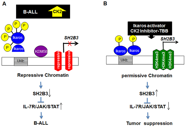 Identifying stage-specific signaling events in malignant transformation and progression and understanding the earliest stages of cellular transformation will provide critical insights in the field of leukemia. These insights will help us to decipher the mechanisms underlying high-risk ALL, delineate a new understanding of B-ALL development and point to potentially drugable pathways for intervention [31, 32]. We identified a novel subclass of high-risk B-ALL that is characterized by IL7RhighSH2B3low expression and associated with Ikaros dysfunction. Ikaros directly binds to and suppresses IL7R and stimulates SH2B3 expression in leukemic cells through chromatin remodeling as shown in the molecular model (Figure 8). Our findings indicate the collaborative effect of Ikaros dysfunction and the IL7R/JAK-STAT/SH2B3 signaling pathway on oncogenesis in high-risk B-ALL. This suggests that the use of CK2 inhibitors to restore Ikaros function combined with the inhibition of IL7R/JAK-STAT could be a potential therapy for treatment of high-risk B-ALL.