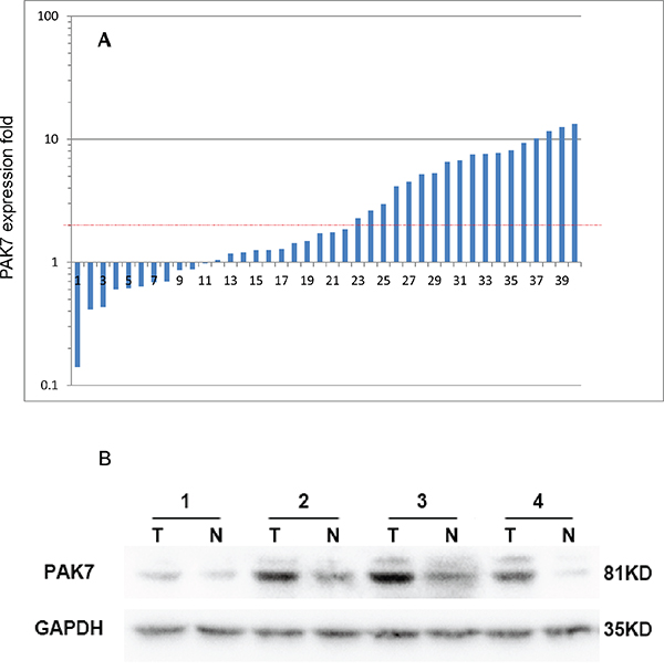 Figure 1: Expression of P21 protein (Cdc42/Rac)-activated kinase 7 (PAK7) in colon cancer tumors and adjacent normal mucosa. A. Relative PAK7 mRNA levels in 40 matched colorectal tumors compared with the levels in normal mucosa specimens. The logarithmic scale of 2-ΔΔCT is used to represent the fold change in quantitative real-time polymerase chain reaction detection; B. Western blotting analysis of PAK7 protein expression in four representative paired colon tumor/normal tissue pairings, glyceroldehyde-3-phosphate dehydrogenase (GAPDH) is used as the loading control.