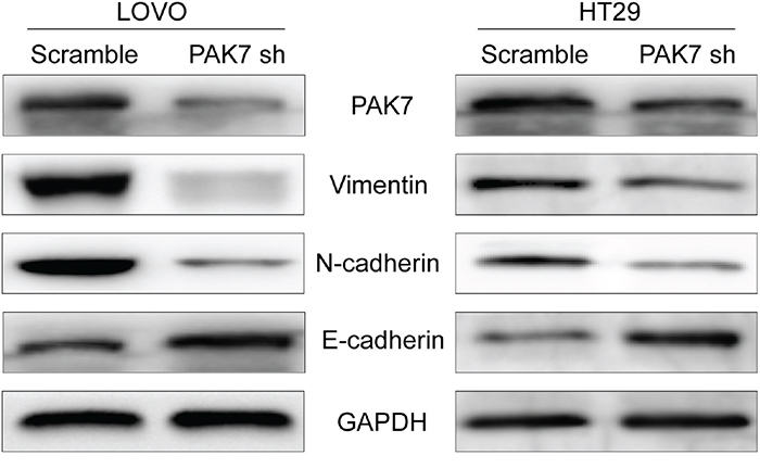 Figure 4: Western blot analysis of EMT markers. Total protein lysates were prepared from LoVo and HT29 cells with PAK7 knockdown.