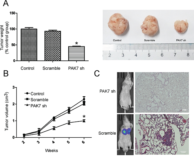 Figure 7: PAK7 inhibition suppresses proliferation and invasion of colon cancer cells in vivo. A. Average weight of tumors harvested in the 6th week. B. Tumor volume curves of mice in different treatment groups. C. Representative images of luciferase signals of mice in 6 weeks after tail vein injection and representative hematoxylin and eosin-stained images of lung tissues. Values are the mean ± SEM from LoVo cells (the results using HT29 were the same).