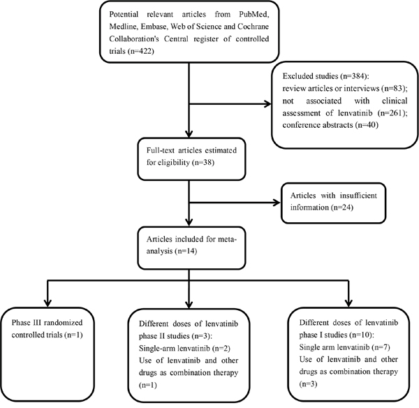 We ran an initial broad search that yielded 422 unique articles after deletion of duplicates. After title and abstract screening, 344 were excluded since they were narrative review articles or interviews, or completely not associated with clinical assessment of lenvatinib. Forty were further excluded for they were conference abstracts based on published clinical trials, leaving 38 potentially relevant studies for full review. After estimating the full texts of these articles, 24 articles were ruled out for insufficient information. Ultimately, 14 eligible studies [13–26] involving a total of 978 patients met our meta-analysis criteria. Two articles [22, 26] with the same first author which had different study designs were both included in our study, one was a phase II trial, and the other was a phase III, randomized multicenter study. No additional unpublished trials were added to the literature search results. A flow diagram of the trial selection process is provided in Figure 1.