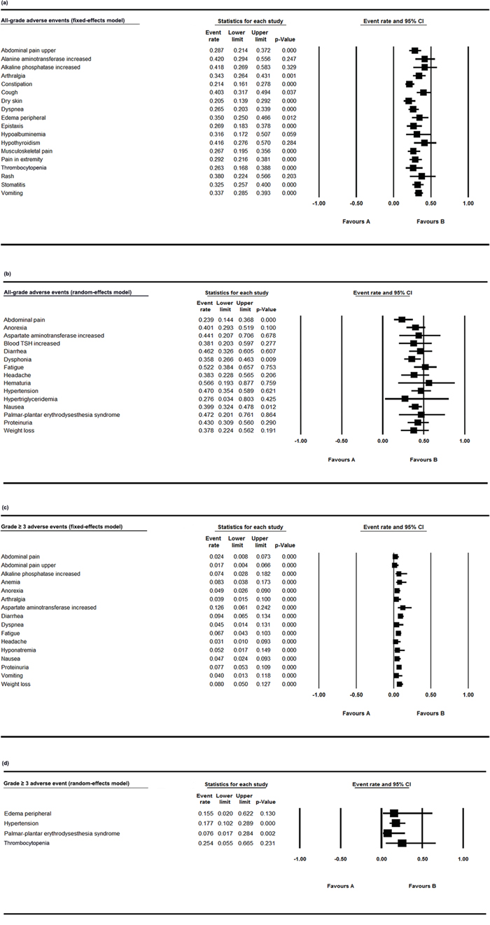 Lenvatinib has brought clinical benefits for patients, but adverse events (AEs) are inevitable such as hypertension, fatigue, proteinuria, nausea, decreased weight and abdominal pain, which may decrease the quality of life of patients and influence their acceptance of treatment [11, 12]. Therefore, we conducted a meta-analysis to estimate various AEs and clinical benefits of lenvatinib.