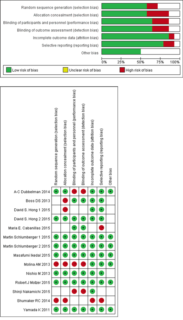 The heterogeneity in our analysis could arise from different tumor types, the very heterogeneous study population with pre-treated disease and the ethnicity difference. In addition, there are several limitations of our study. Firstly, because lenvatinib is a relatively new drug, reports about it are few and are mostly phase I and II studies. Secondly, only one study provided the overall survival data, so prolonged follow-ups are needed. Thirdly, we did not perform subgroup analysis of melanoma and non-small-cell lung cancer because of lack of enough information.
