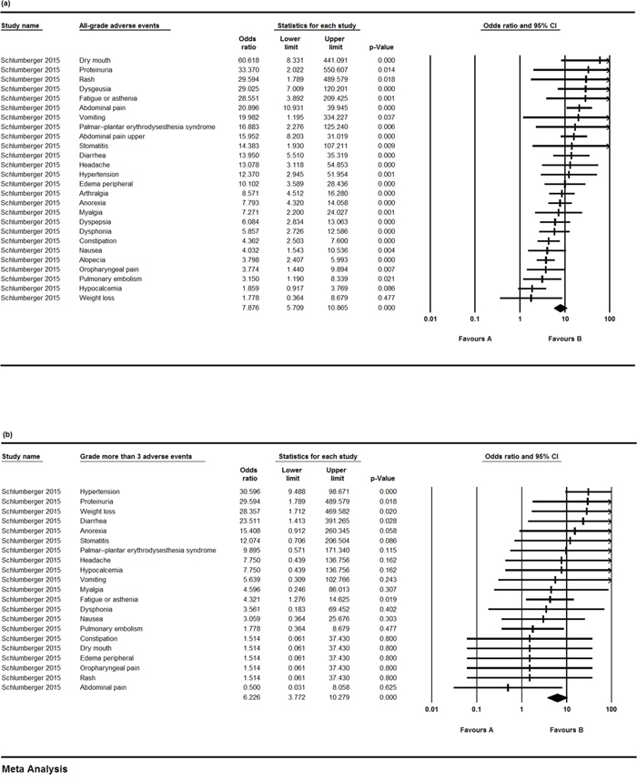 Figure 4: The odds ratios (ORs) of adverse events (AEs) in a controlled trial comparing lenvatinib and placebo. a. OR and 95% CIs of all-grade AEs using a random-effects model; b. OR and 95% CIs of grade ≥ 3 AEs using a fixed-effects model.