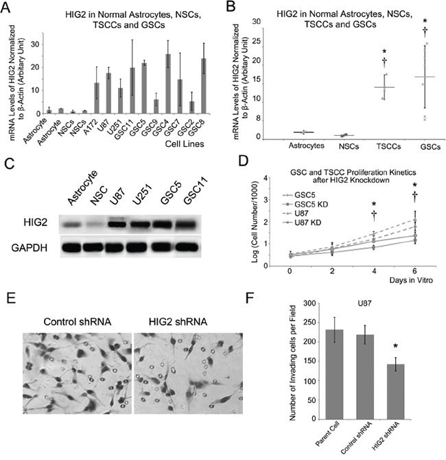 Figure 2: HIG2 is highly expressed in GBM cell lines and promotes GBM cell proliferation and invasion. HIG2 is overexpressed in GBM cell lines, including TSCCs and GSCs, compared to normal astrocytes (*P<0.05) and NSCs (†P<0.05) A & B. Representative western blots showing HIG2 in TSCCs and GSCs, but little-to-no detection in astrocytes and NSCs C. (D) HIG2 knockdown inhibited GSC proliferation in U87 (*P<0.05) and GSC cells (†P<0.05) D. Transwell invasion assay showing that HIG2 knockdown inhibited U87 cell invasiveness E & F.