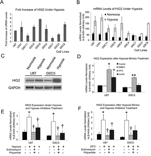 Figure 3: HIG2 is increased under hypoxia in TSCCs and GSCs. HIG2 fold-increase and relative mRNA levels in TSCCs and GSCs after exposure to hypoxia for 24 h A & B. Representative western blots showing increased HIG2 under 1% O2 hypoxic conditions for 24 h in TSCCs and GSCs C. HIG2 mRNA was increased after treatment with hypoxia mimics (DFO and CoCl2) D. *P<0.05 and **P<0.05 compared to DMSO-treated groups. Hypoxia inhibitors echinomycin or polyamide inhibited HIG2 expression induced by hypoxia or hypoxia mimics E & F. *P<0.05 compared to control group; †P<0.05 compared to hypoxia or hypoxia mimics.