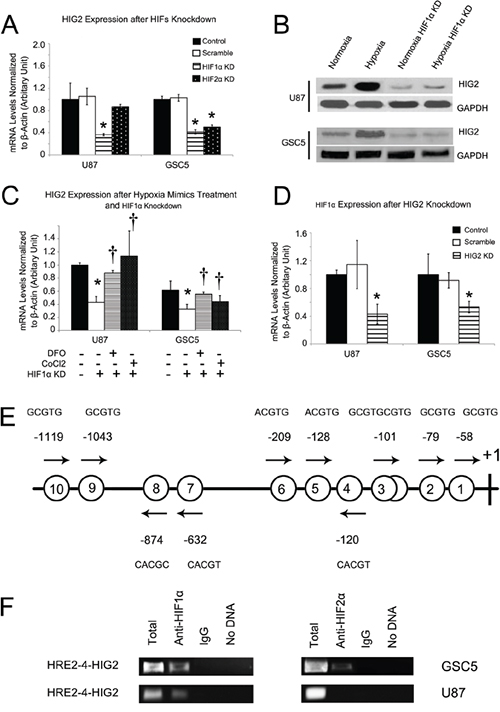 Figure 4: HIFs regulate HIG2 expression, and HIG2 regulates HIF1α. HIG2 was inhibited after HIF1α knockdown in both TSCCs and GSCs and also after HIF2α knockdown in TSCs A. Western blot showing HIG2 upregulation under hypoxia conditions and downregulation with HIF1α inhibition B. HIF1α knockdown also inhibited HIG2 upregulation induced by hypoxia mimics C. †P<0.05 compared to hypoxia mimics. HIF1α was downregulated after HIG2 knockdown in both TSCCs and GSCs D. Location of putative hypoxia response elements (HRE) in the -1190/+133 HIG2 gene promoter E. Putative HREs are represented by circled numbers and sequences are displayed. ChIP using HIF1α or HIF2α antibodies and the primer spanning the 1st to 6th HREs in the HIG2 promoter F. *P<0.05 compared to control group.