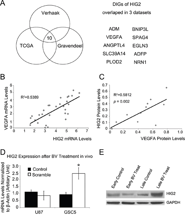 Figure 6: HIG2 is correlated with VEGFA and is upregulated after anti-VEGF treatment. Bioinformatics analyses from 3 datasets revealed putative direct-interacting genes (DIGs) for HIG2 A. Correlation analysis of HIG2 and VEGFA expression in GBM samples by qPCR (P<0.05) B. HIG2 and VEGFA western blot signal intensities relative to GAPDH were quantified by densitometry and correlation analysis, showing that HIG2 is correlated with VEGFA (P<0.05) C. HIG2 mRNA and protein levels in intracranial U87 xenograft tumors at early or late stages D & E. *P<0.05 compared to control.